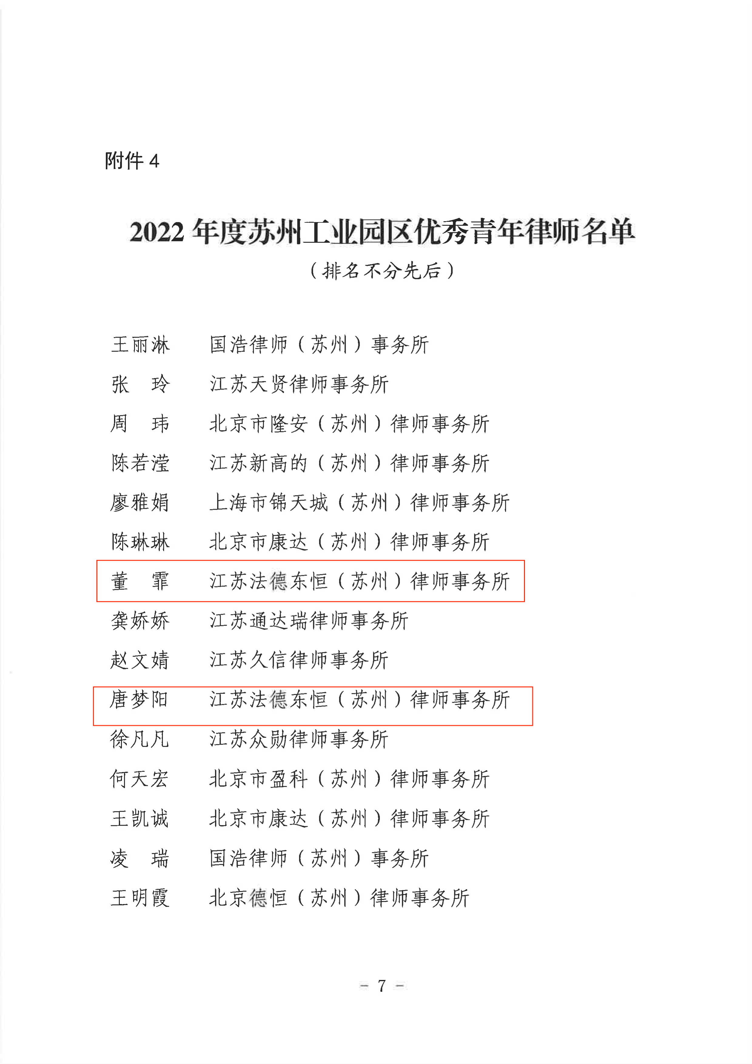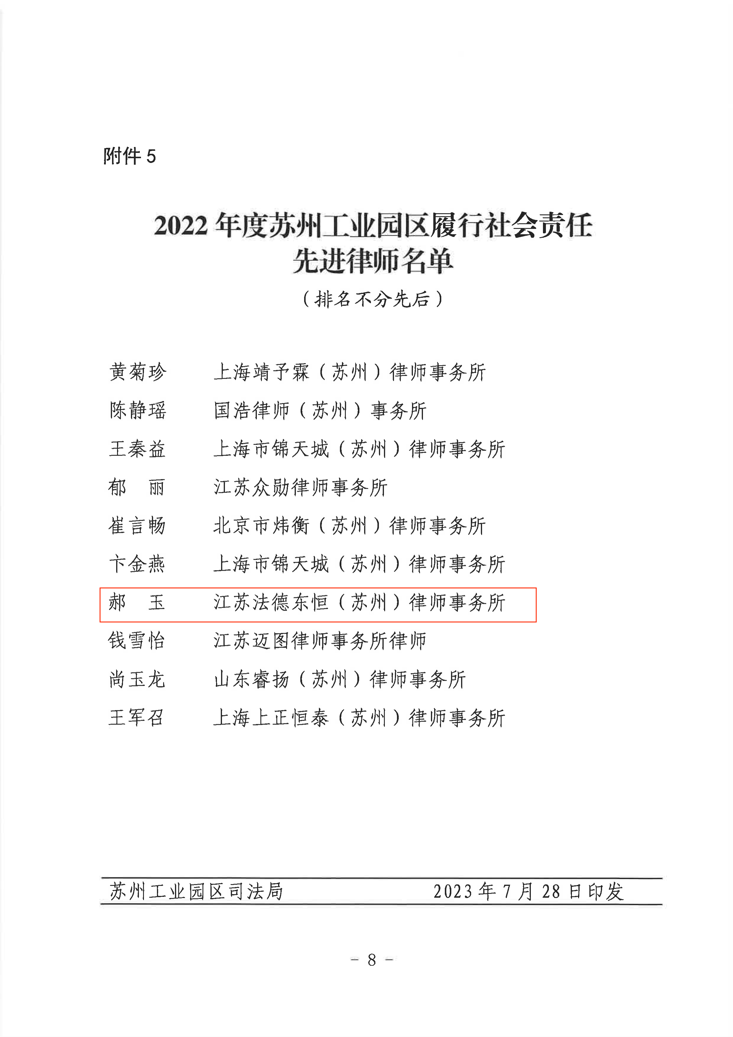 2023年7月,為表彰先進,樹立典型,持續(xù)打造“非凡園區(qū)、非凡律師”品牌,蘇州工業(yè)園區(qū)司法局、律師協(xié)會開展了“2022年度蘇州工業(yè)園區(qū)優(yōu)秀律所、優(yōu)秀律師”等評選表彰活動。經(jīng)嚴格評審程序,江蘇法德東恒(蘇州)律師事務(wù)所獲得“履行社會責任律師事務(wù)所”稱號,董霏、唐夢陽律師獲得“優(yōu)秀青年律師”稱號,郝玉律師獲得“履行社會責任先進律師”稱號。