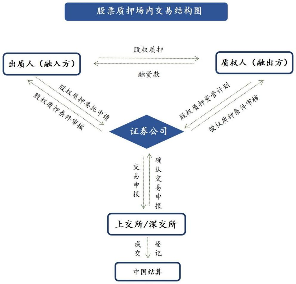場內(nèi)質(zhì)押是指證券公司根據(jù)融入方和融出方的委托向證券交易所綜合業(yè)務(wù)平臺的股票質(zhì)押回購交易系統(tǒng)進行交易申報。中國證券登記結(jié)算有限責任公司(簡稱:中國結(jié)算)再依據(jù)證券交易所確認的成交結(jié)果為股票質(zhì)押回購提供相應(yīng)的證券質(zhì)押登記和清算交收等業(yè)務(wù)處理服務(wù)。場內(nèi)交易結(jié)構(gòu)圖如下: