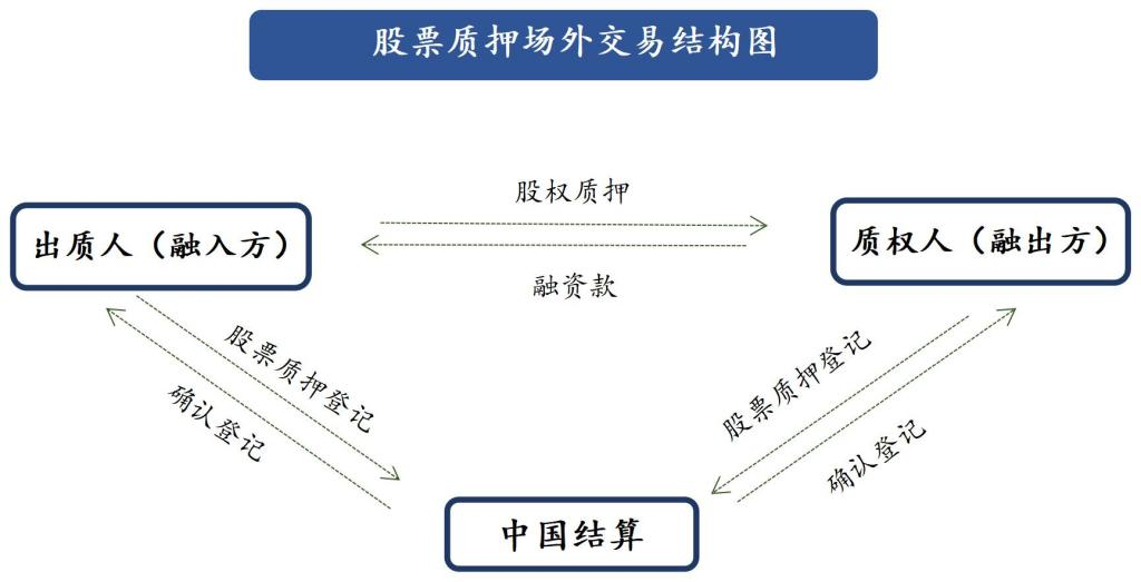 區(qū)別于場內(nèi)質(zhì)押是由證券公司作為主要的資金融出方,場外模式是由銀行、信托公司、基金子公司等作為主要的資金融出方,證券公司不得作為融出方參與場外質(zhì)押。場外交易不需通過交易所系統(tǒng),而是直接到中國結(jié)算辦理質(zhì)押登記,或者通過證券公司遠程電子化申報方式辦理質(zhì)押登記。2023年上半年,場內(nèi)交易占比約45.5%,場外交易占比約54.5%,大致呈現(xiàn)對半分的趨勢。場外交易結(jié)構(gòu)圖如下: