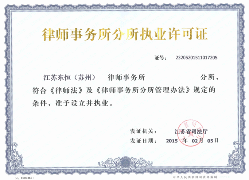 經(jīng)江蘇省司法廳批準,江蘇法德東恒律師事務所蘇州分所于2015年2月9日正式成立。蘇州分所是法德東恒在江蘇省內(nèi)設立的首家分所,位于蘇州市工業(yè)園區(qū)蘇州大道東381號商旅大廈15樓,擁有460平米辦公場所,可容納30名律師辦公。