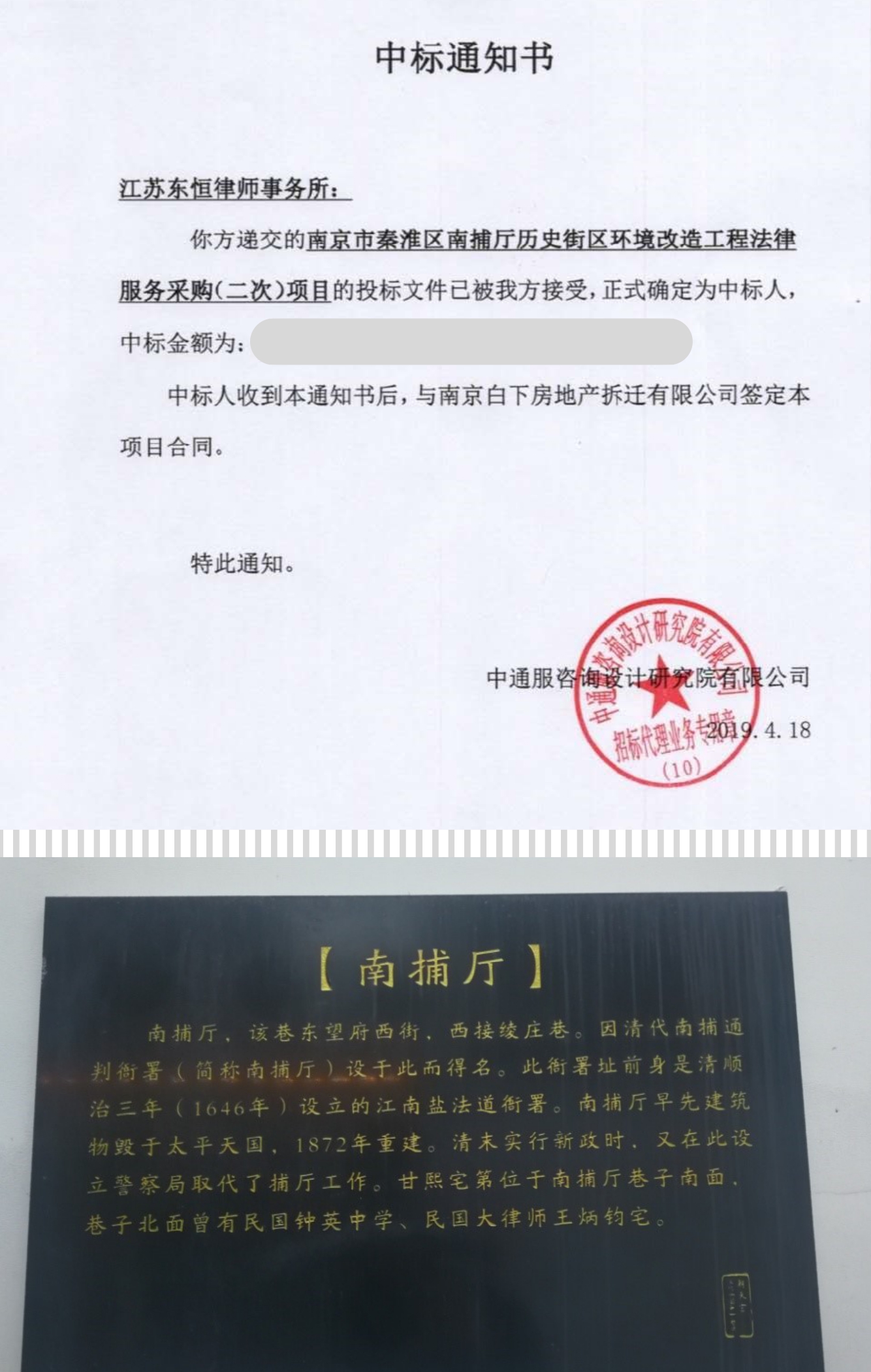 南京市秦淮區(qū)南捕廳歷史街區(qū)環(huán)境改造工程,是棚戶區(qū)改造與歷史文化保護相結(jié)合的開發(fā)建設項目,對南京老城南片區(qū)的改造具有重要意義。為依法推進征收拆遷工作,經(jīng)公開招投標,江蘇法德東恒律師事務所憑借公司制一體化運營管理體制,專業(yè)化、團隊化的服務模式,標準化、規(guī)范化的服務方式以及長期深耕于征收拆遷、舊城改造法律服務領域的經(jīng)驗優(yōu)勢,各項技術指標及法律服務方案,得到了專家評委的一致認可,在8家競標人中脫穎而出,以最高得分中標。
