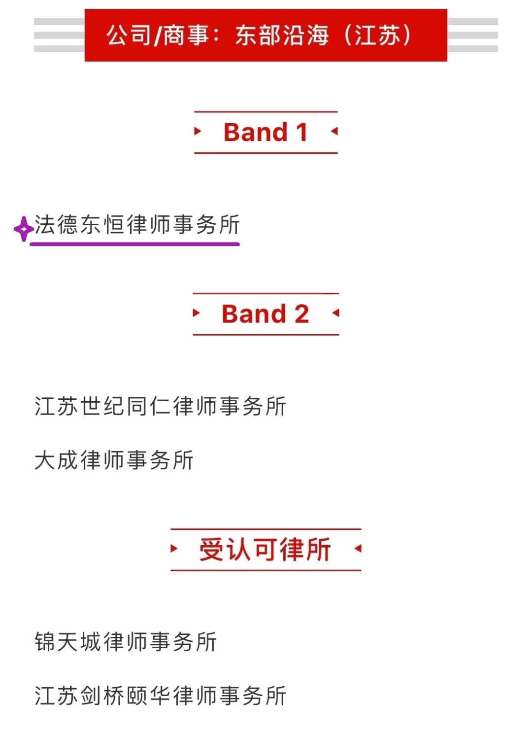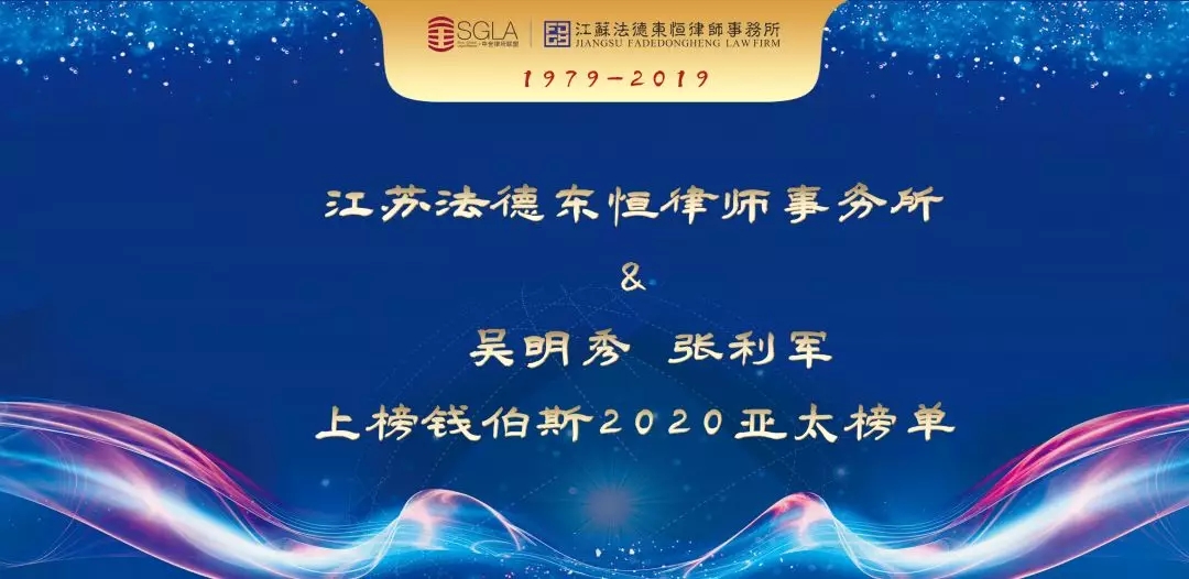 北京時間2019年12月5日晚,著名法律評級機構(gòu)錢伯斯(Chambers and Partners)發(fā)布了《2020亞太法律指南》(2020Asia-Pacific Guide)。錢伯斯榜單自1969年創(chuàng)評以來,一直被業(yè)界視為最高法律評級標準。錢伯斯通過嚴謹?shù)恼{(diào)研和評價體系,全面考察全球所有司法管轄區(qū)內(nèi)的律所,綜合客戶反饋、調(diào)研及市場數(shù)據(jù),評選出各個法律領(lǐng)域的全球知名律師事務(wù)所和頂尖律師,是全球客戶尋求高端法律服務(wù)最值得信賴的權(quán)威參考之一。江蘇法德東恒律師事務(wù)所憑借扎實的業(yè)務(wù)能力、出色的法律服務(wù)質(zhì)量及長期積累的優(yōu)秀信譽,在本年度榜單中再獲佳績。