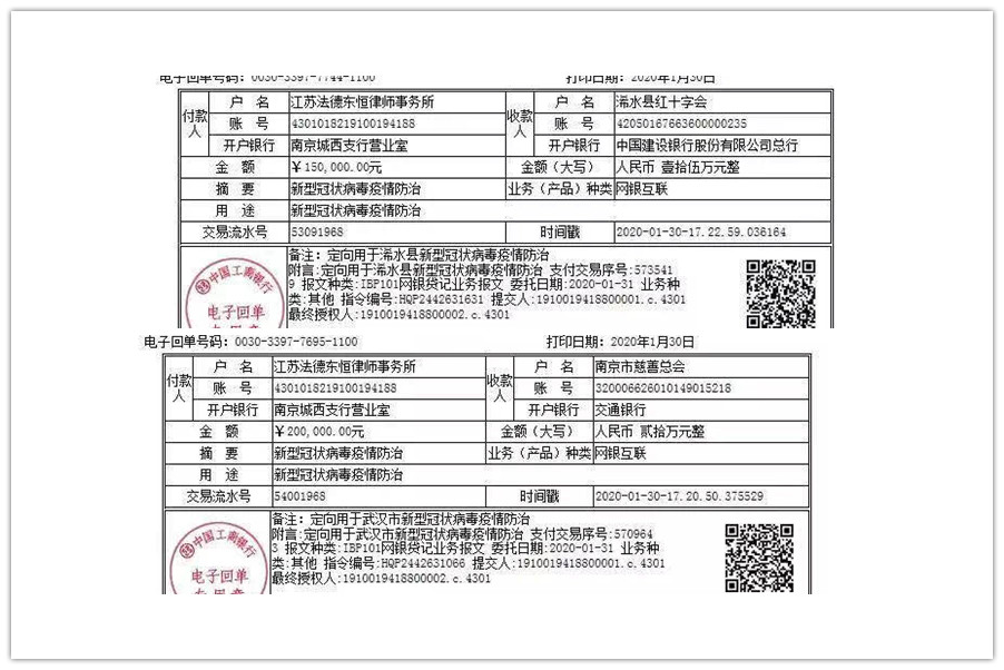 倡議發(fā)出后,僅一天時間,總分所同事積極響應,在已參加了各類組織的捐贈活動的基礎上,又募得捐款35萬元。經(jīng)執(zhí)委會研究決定,其中15萬元捐贈給疫情較為嚴重且急需援助的湖北省黃岡市浠水縣紅十字會,用于購置符合疫情防控要求的物資,剩余20萬元捐贈給南京市慈善總會定向用于武漢市新型冠狀病毒防控工作。上述款項已第一時間轉入浠水縣紅十字會和南京市慈善總會賬戶。
