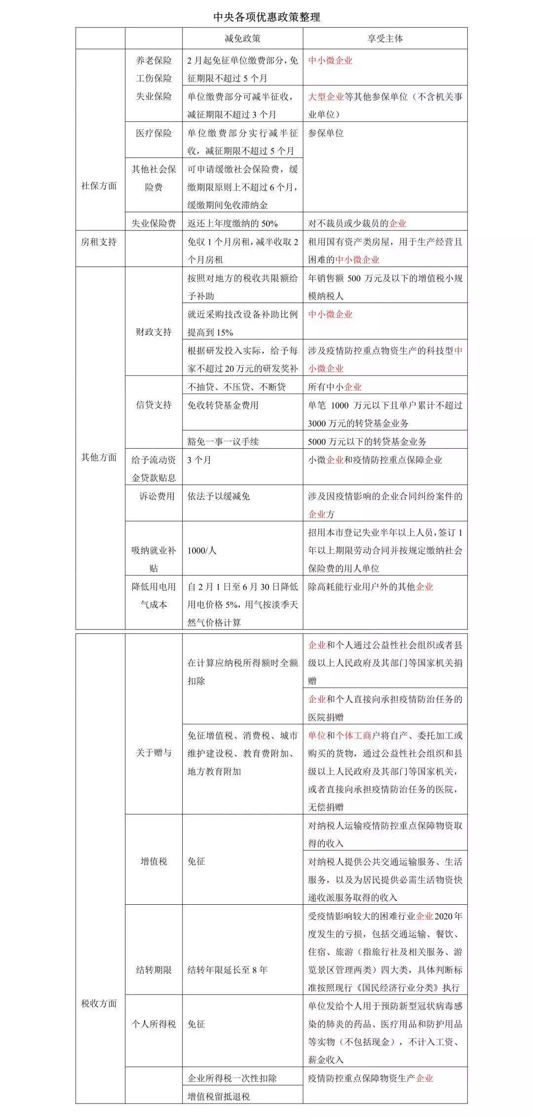 為了讓受到本次疫情的影響的各類企業(yè),尤其是占全國(guó)企業(yè)總數(shù)99.8%,就業(yè)人數(shù)80%的中、小、微企業(yè)能夠減輕負(fù)擔(dān),度過寒冬,從中央到地方,均出臺(tái)了相關(guān)優(yōu)惠政策,從社保、醫(yī)保、稅收、房租、甚至用電用氣費(fèi)用等各方面給予企業(yè)復(fù)工、復(fù)產(chǎn)提供支持。