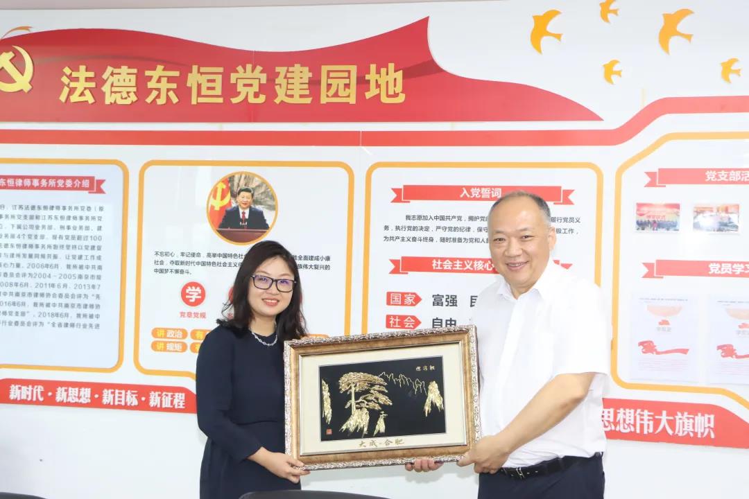 6月18日上午,北京大成(合肥)律師事務(wù)所主任紀(jì)敏,黨支部書記彭青,管委會(huì)委員郭瀚昭、王軍、張曉偉,監(jiān)委會(huì)委員馬良景等一行在北京大成(南京)律師事務(wù)所主任沈永明陪同下,蒞臨江蘇法德東恒律師事務(wù)所進(jìn)行考察交流。法德東恒主任萬永松,執(zhí)委會(huì)委員張曉蒙、周毅,監(jiān)委會(huì)委員孟蘭凱熱情接待并參加座談。