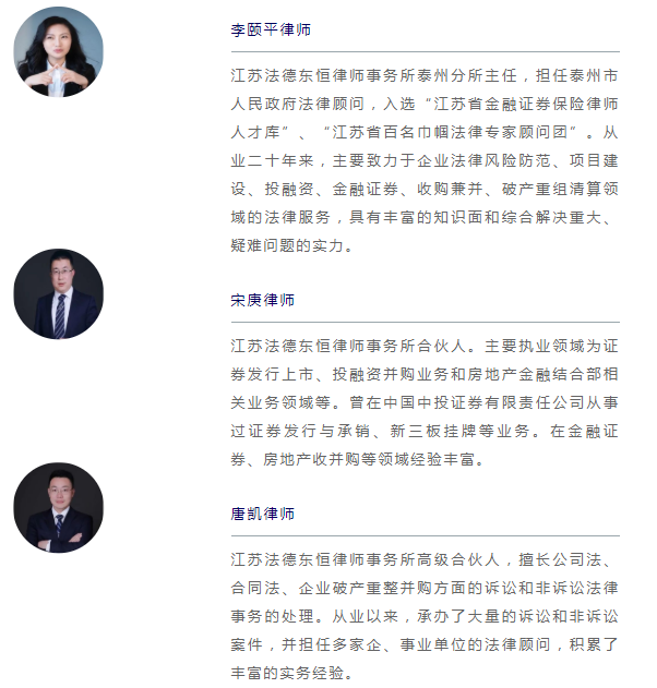 法德東恒總所與泰州分所協(xié)同承辦了姜堰經(jīng)開集團的本次非公開發(fā)行業(yè)務(wù),項目組由李頤平律師團隊、宋庚律師團隊及唐凱律師團隊組成,項目組與各方密切配合,獲得一致好評,為實現(xiàn)本次項目的全面、高效展現(xiàn)了極高的業(yè)務(wù)水平及專業(yè)能力。
