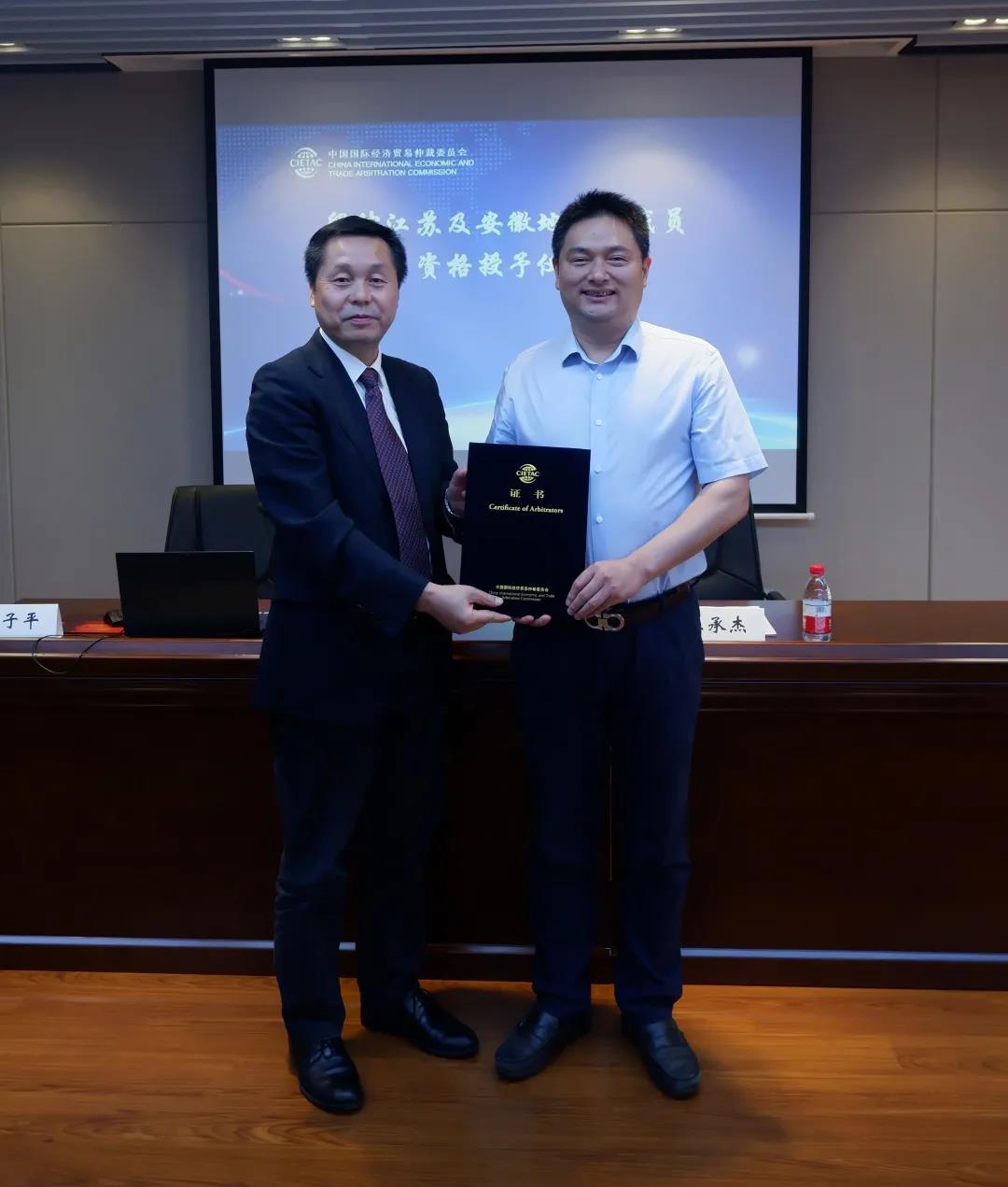(貿仲副主任兼秘書長王承杰為張利軍律師頒發(fā)證書。)