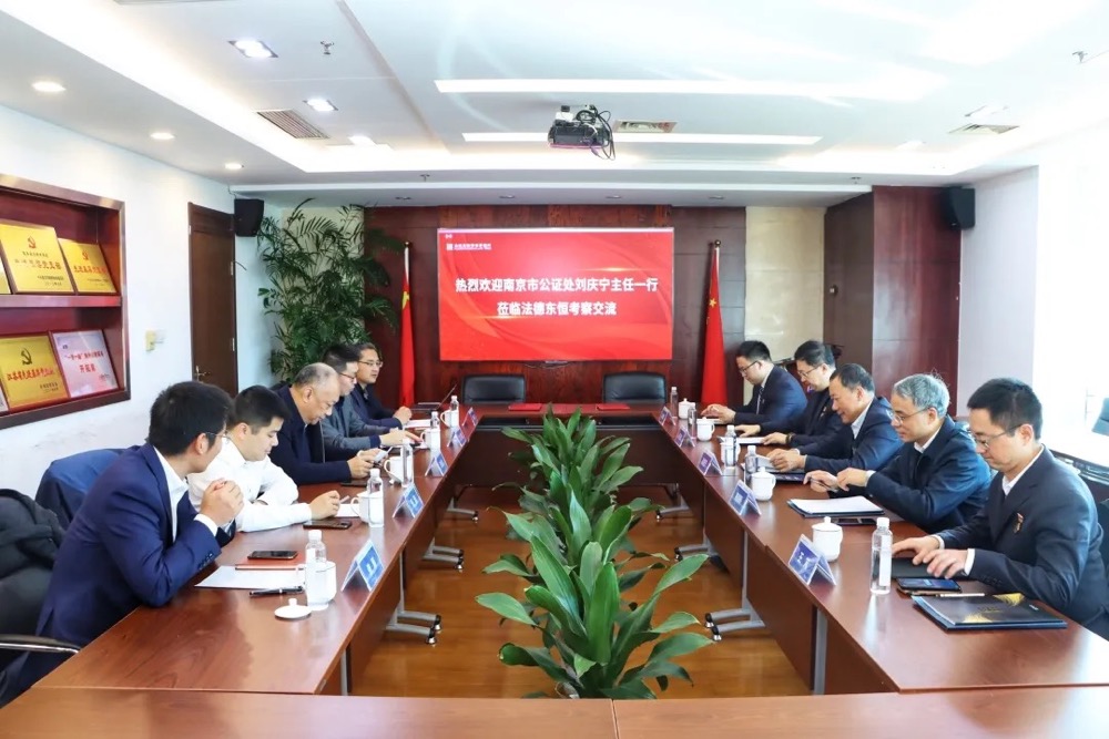 12月1日,南京公證處主任劉慶寧、副主任陳國橋、辦公室主任張寧沛、金融科技部部長王芃、公證員陳繼輝一行蒞臨法德東恒律師事務所考察交流。律所主任萬永松、管理合伙人王磊、執(zhí)委會委員汪源、監(jiān)委會委員管曉東、高級合伙人張雁熱情接待并參加簽約儀式。