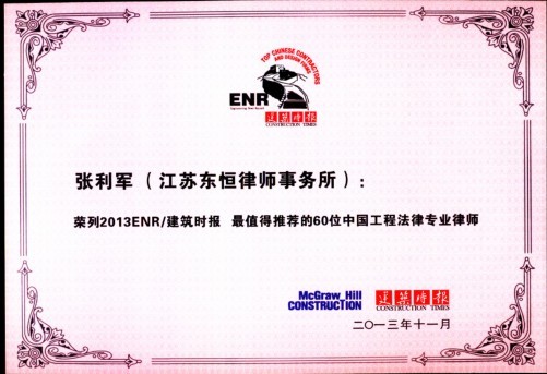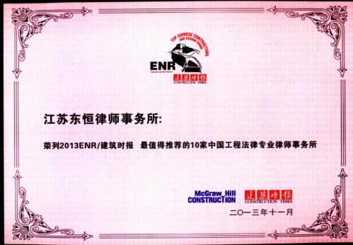建筑時(shí)報(bào)和ENR(美國《工程新聞紀(jì)錄》是專注于追蹤建筑服務(wù)市場(chǎng)的前沿信息和最新動(dòng)態(tài)的最具權(quán)威性的媒體,此獎(jiǎng)的評(píng)選以事務(wù)所的專業(yè)能力、業(yè)績表現(xiàn)、執(zhí)業(yè)人數(shù)、行業(yè)地位及社會(huì)影響等作為考核標(biāo)準(zhǔn),法德東恒所是入選該項(xiàng)榮譽(yù)的唯一一家江蘇律師事務(wù)所。這得益于法德東恒所和張利軍主任在建筑房地產(chǎn)等核心法律業(yè)務(wù)領(lǐng)域所取得的良好成績和杰出貢獻(xiàn),此前,法德東恒所還曾榮獲“2011年最值得推薦的30家工程法律專業(yè)律師事務(wù)所(團(tuán)隊(duì))”稱號(hào)和2012亞洲法律雜志(ALB)最佳房地產(chǎn)律師事務(wù)所大獎(jiǎng)。