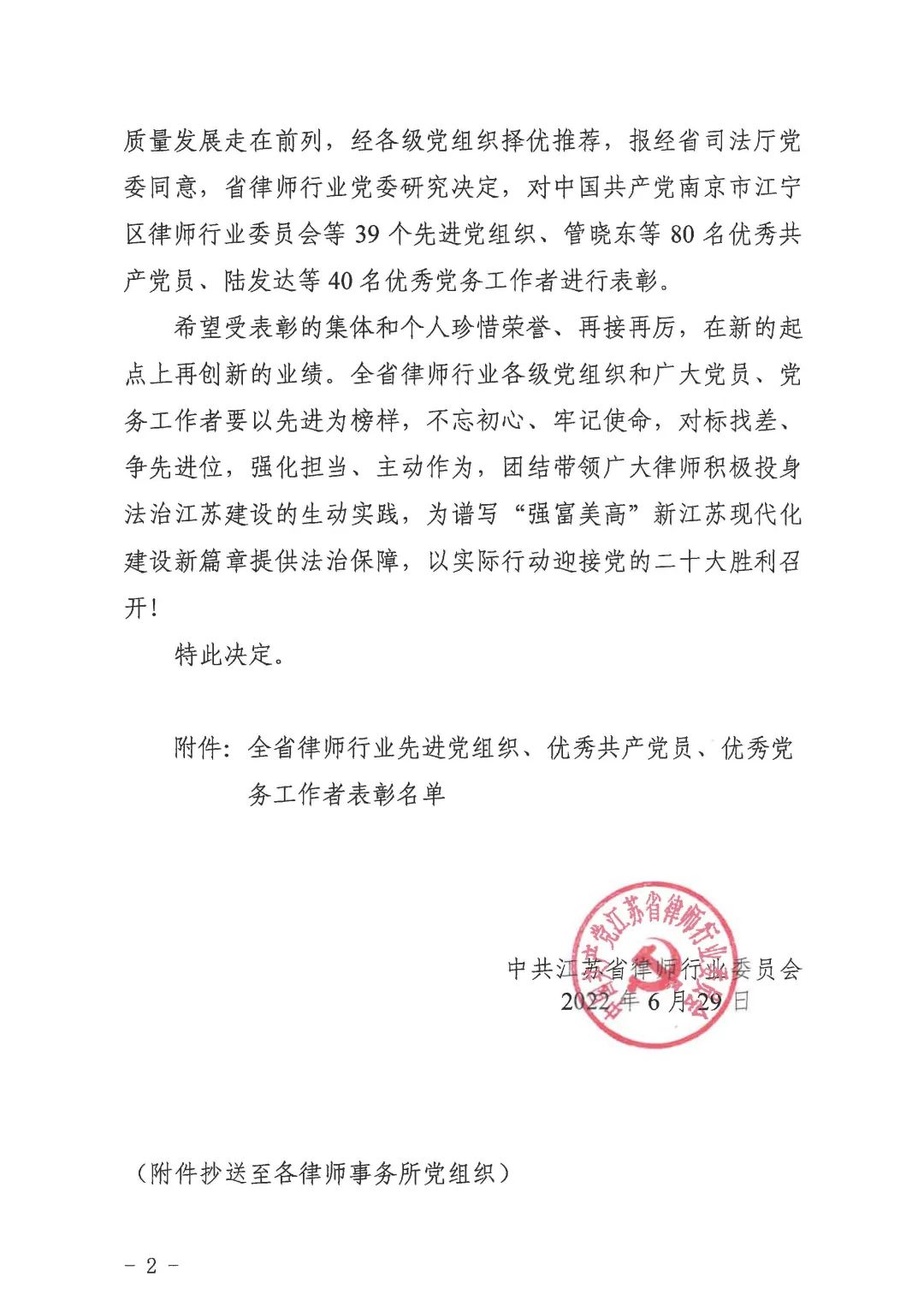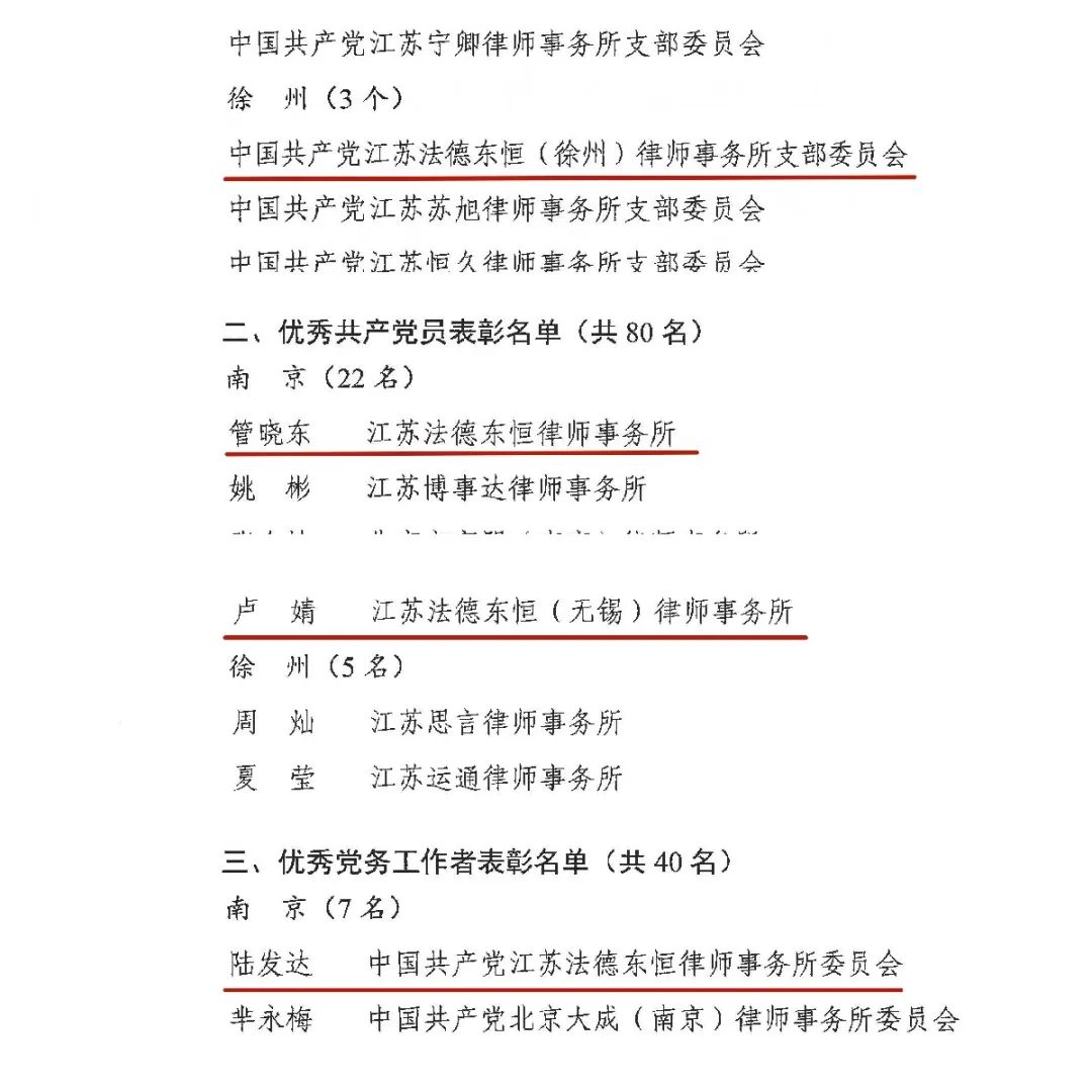 在建黨101周年之際,為表彰先進(jìn)、弘揚(yáng)正氣、激勵(lì)斗志,省律師行業(yè)黨委決定對(duì)全省律師行業(yè)先進(jìn)黨組織、優(yōu)秀共產(chǎn)黨員、優(yōu)秀黨務(wù)工作者進(jìn)行表彰。其中,法德東恒(徐州)律師事務(wù)所黨支部榮獲先進(jìn)黨組織稱(chēng)號(hào);法德東恒律師事務(wù)所管曉東律師、法德東恒(無(wú)錫)律師事務(wù)所盧婧律師榮獲優(yōu)秀共產(chǎn)黨員稱(chēng)號(hào);法德東恒律師事務(wù)所陸發(fā)達(dá)律師榮獲優(yōu)秀黨務(wù)工作者稱(chēng)號(hào)。