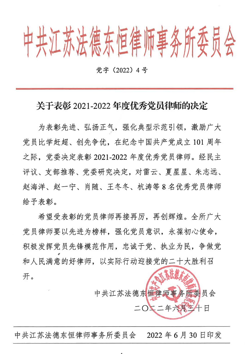 會上由黨委委員汪源宣讀了中共江蘇法德東恒律師事務(wù)所委員會對2021-2022年度優(yōu)秀黨員律師的表彰決定。