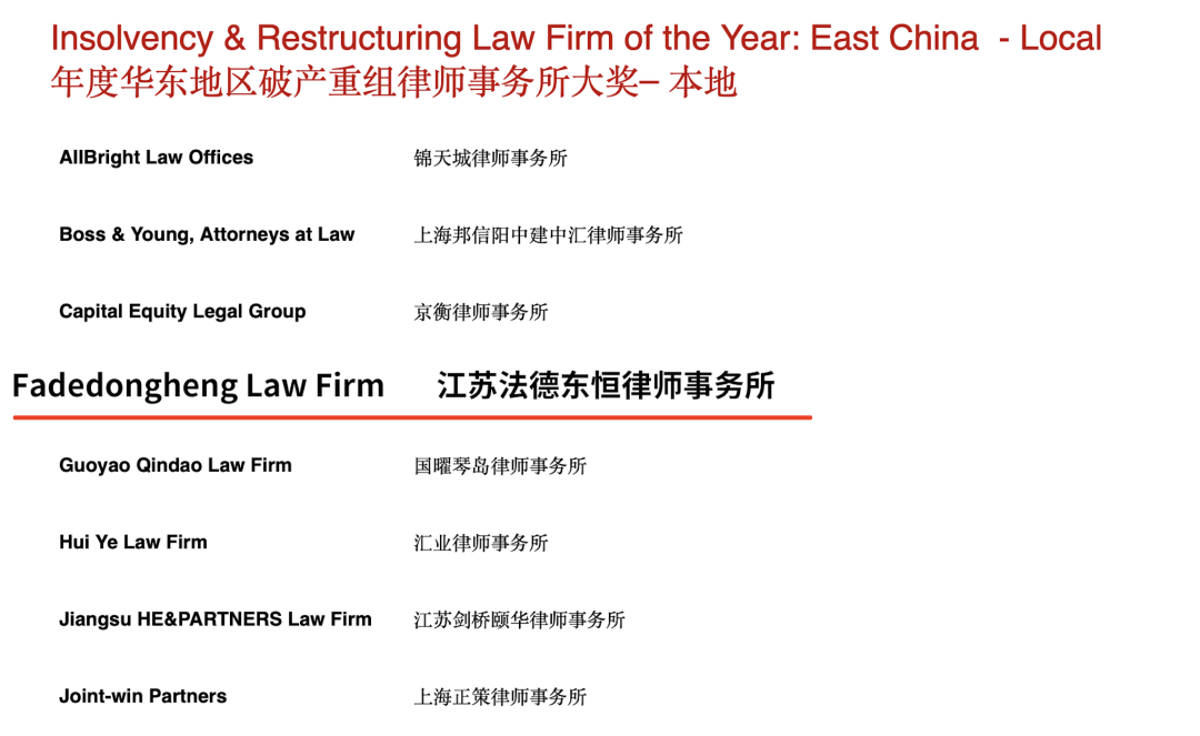 法德東恒入選2022ALB中國華東地區(qū)破產(chǎn)重組律師事務(wù)所大獎(jiǎng)