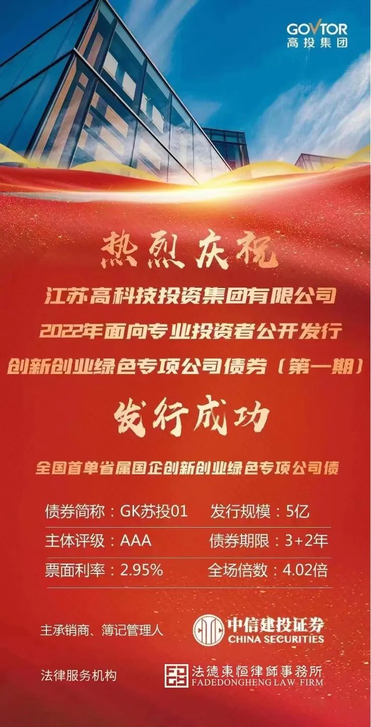 7月14日,江蘇高科技投資集團有限公司2022年面向?qū)I(yè)投資者公開發(fā)行創(chuàng)新創(chuàng)業(yè)綠色專項公司債券在上交所成功發(fā)行。