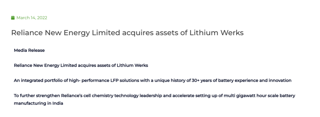 本次收購項目,是通過Reliance集團旗下綠色業(yè)務(wù)部門信實新能源(Reliance New Energy)在荷蘭設(shè)立子公司進行的。據(jù)信實工業(yè)主席表示,相比其他化學(xué)電池,磷酸鐵鋰電池具有制造成本低和使用壽命長的優(yōu)勢。本次收購是信實工業(yè)從2022年至2024年投資7500億印度盧比(約合98.7億美元)于清潔能源業(yè)務(wù)計劃的一部分,旨在到2035年實現(xiàn)碳中和。