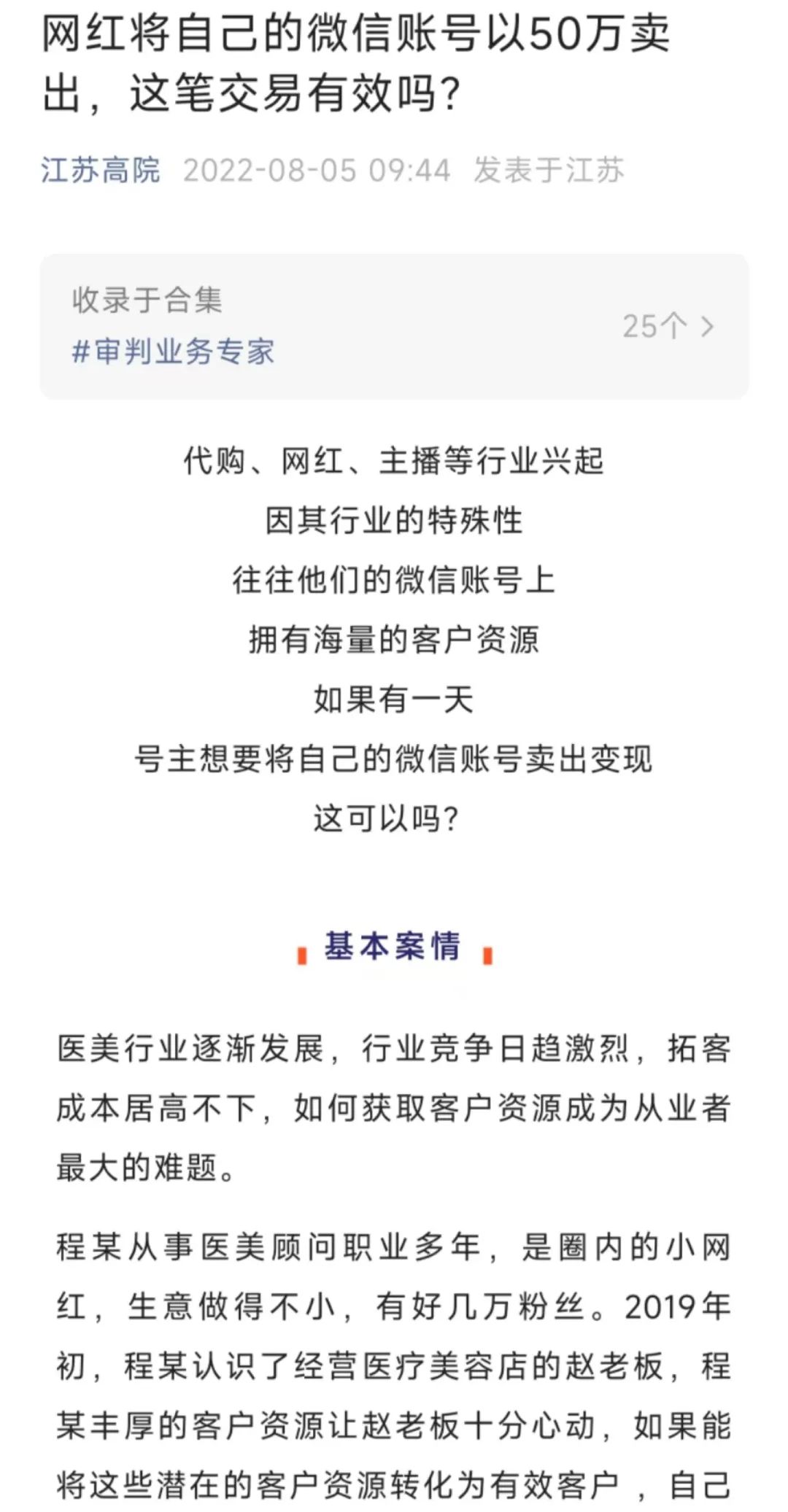 《網(wǎng)紅將自己的微信公眾號(hào)以50萬(wàn)元賣出,這筆交易有效嗎?》,2022年8月5日,由我所蘇明、王樂(lè)律師代理的“ 程衛(wèi)紅與趙春飛、深圳市騰訊計(jì)算機(jī)系統(tǒng)有限公司合同糾紛案”被江蘇省高級(jí)人民法院官方微信公眾號(hào)“江蘇高院”作為“審判業(yè)務(wù)專家”典型案例收錄并推送,該文章一經(jīng)發(fā)出,就獲得2萬(wàn)瀏覽量。