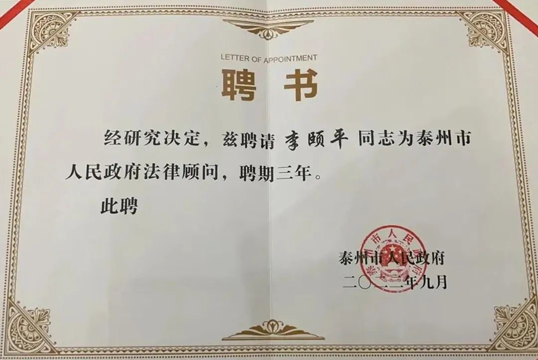資訊?|?泰州分所李頤平主任續(xù)任泰州市政府法律顧問