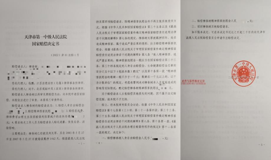 2022年8月31日,天津市第一中級(jí)人民法院正式?jīng)Q定向伸冤近二十年被改判無罪的柳春樹作出國家賠償,該《國家賠償決定書》將于2022年10月1日發(fā)生法律效力。