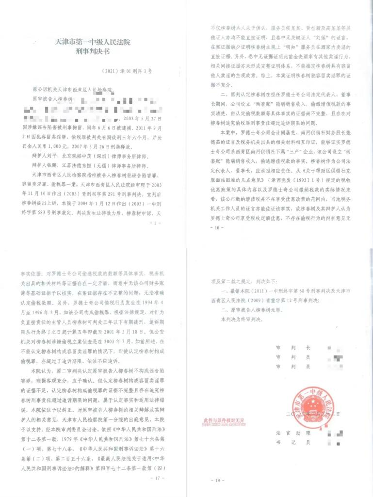 2022年2月23日,天津市第一中級(jí)人民法院正式當(dāng)庭宣告柳春樹全案無罪,并依法撤銷了原判決。