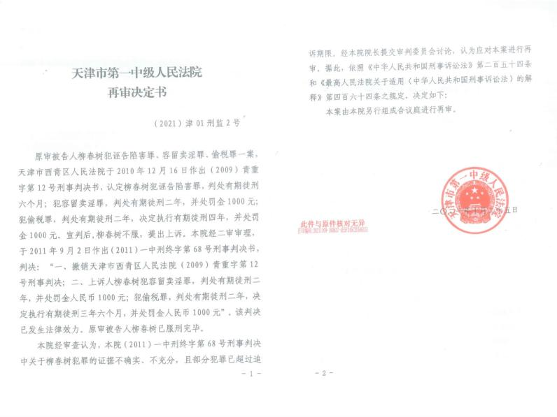 2021年10月25日,在代理申訴近一年后,天津市第一中級(jí)人民法院依法決定再審柳春樹案。