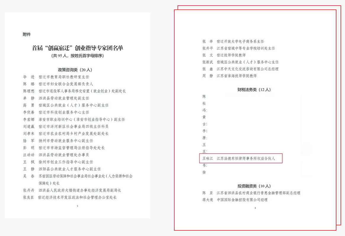 近日,宿遷市人力資源和社會(huì)保障局公布了首屆“創(chuàng)贏宿遷”創(chuàng)業(yè)指導(dǎo)專家團(tuán)名單,法德東恒(宿遷)律師事務(wù)所主任、權(quán)益合伙人王詠江被選聘為宿遷市首屆“創(chuàng)贏宿遷”創(chuàng)業(yè)指導(dǎo)專家。