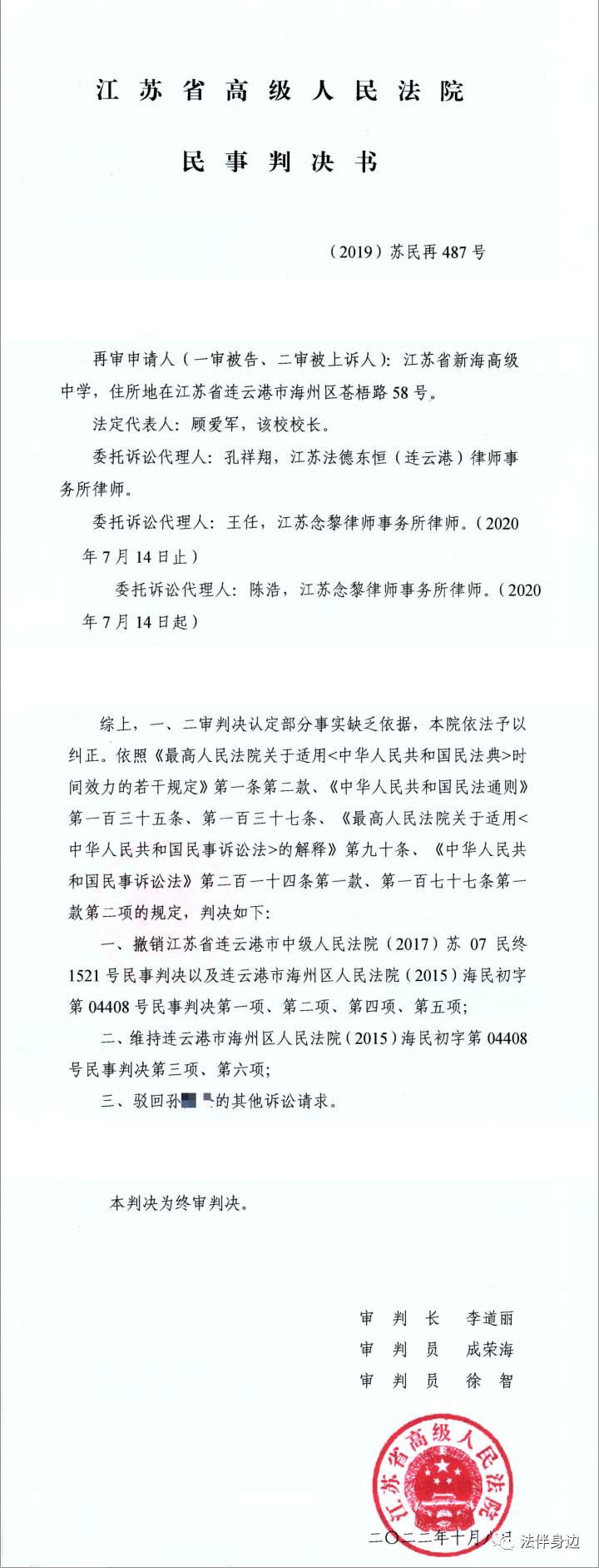 2019年10月,江蘇省高院經(jīng)過聽證、審查,下達(dá)裁定書終止執(zhí)行并由省高院直接提審,使得困擾連云港市教育局、新海高中數(shù)年的兩千余萬債務(wù)得以緩解。