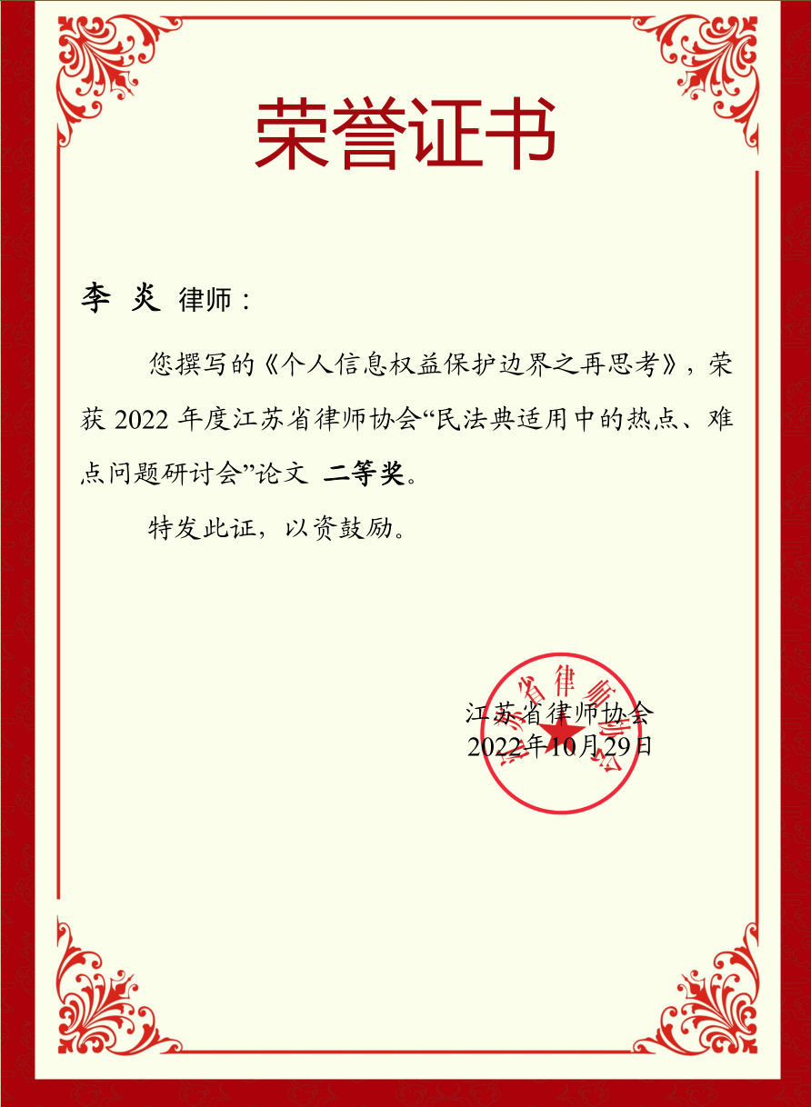 在江蘇省律師協(xié)會舉辦的2022年“民法典適用中的熱點、難點問題”研討會中,本所李炎律師的論文《個人信息權益保護邊界之再思考——以權利射程為視角》榮獲研討會論文二等獎。