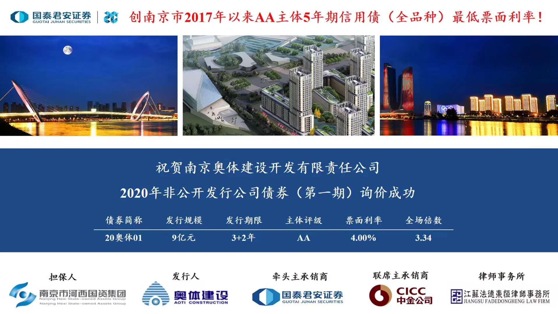 法德東恒助力奧體建設(shè)2020年非公開發(fā)行公司債券(第一期)詢價成功