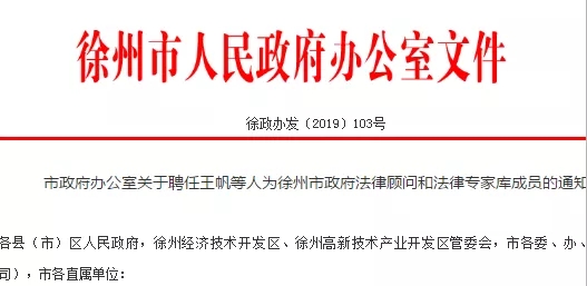 法德東恒律師獲聘徐州市政府法律顧問及法律專家?guī)斐蓡T