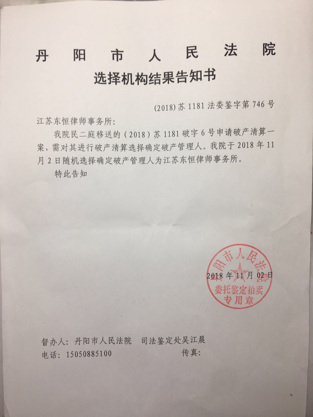 立足本市,輻射江蘇|?法德東恒所被丹陽市人民法院確定為破產(chǎn)管理人