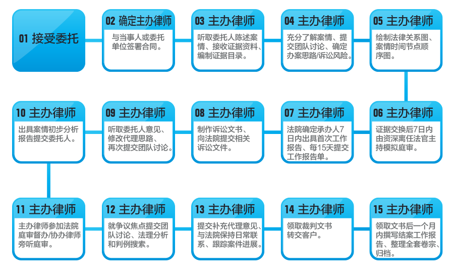 無論是訴訟還是非訴訟,都有一系列復雜的流程。一家優(yōu)秀的律所首先是把一切業(yè)務(wù)標準化,其次是不斷優(yōu)化這些業(yè)務(wù)流程。在高端商事爭議解決領(lǐng)域,我們創(chuàng)造出嚴密高效的案件流程管理體系,每一個案件都將經(jīng)過13步標準化流程處理,你可以像查快遞一樣隨時了解案件的進程和發(fā)展態(tài)勢,我們也可以對案件關(guān)鍵節(jié)點進行精確控制,確保法德東恒辦理案件的品質(zhì),創(chuàng)造性地為客戶解決問題。